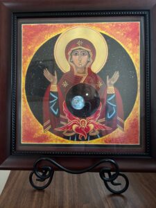 In prayer I often sit these days with the icon Mary of the Cosmos, an image created by Sr. Bernadette Bostwick, a member of Sisters of the Earth Community at Green Mountain Monastery. The icon resonates with Pope Francis’ words in Laudato Si, “Mary, the Mother who cared for Jesus now cares with motherly affection and pain for this wounded world.” I consider how the universe flows through her, how she lifts up her arms in prayer, how she meets the viewer with a steady gaze. Above all, I notice how she embraces Earth and moon, holding everything together – our violence and pain, our longing and hope. There is nowhere we can go where her love does not go with us.